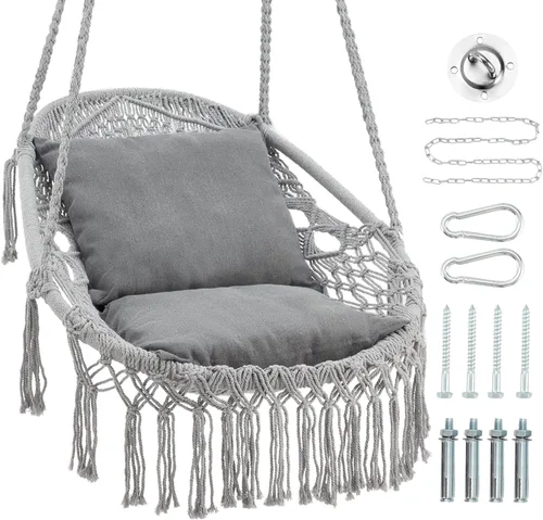 Disfruta del tiempo de ocio: añade un poco de elegancia bohemia a tu hogar con una silla columpio de macramé. La silla colgante tejida a mano y el diseño de silueta de cáscara de huevo es tan cómodo, ya sea en interiores o exteriores, disfruta de tu tiempo libre. Seguridad y comodidad: nuestra silla colgante adopta material de alta densidad, que no solo garantiza suficiente apoyo, sino que también reduce el peso y es fácil de llevar. También ofrecemos dos cojines de alta calidad con bolsas de compresión de aire que comprimen los cojines cuando no están en uso, ahorrando espacio. Aplicación multiescena: esta elegante silla hamaca es una gran opción para tu dormitorio, sala de estar, balcón, habitación de los niños y un pequeño espacio en tu hogar donde puedes relajarte y entretenerte. También puede optar por disfrutar del sol y la brisa en el jardín, en la playa o en la terraza. Siente los buenos momentos de tu vida. Diseño elegante y cómodo: la acogedora silla columpio hamaca tiene un diseño único y hermoso, y puede reflejar fácilmente tu gusto personal. Nos centramos en brindar una mejor experiencia ofreciendo cuerda tejida a mano y utilizando principios ergonómicos, diseño en forma de cáscara de huevo para hacer que nuestra hamaca de cuerda sea más adecuada para el cuerpo, más cómoda y más fácil de sentar. Práctico y fácil de colgar: nuestra silla oscilante está equipada con kits completos para colgar que pueden satisfacer tus demandas de instalación en interiores y exteriores. Y puedes elegir un soporte adecuado o colocarlo en un árbol o en cualquier lugar resistente dentro del rango máximo de carga. Solo toma un momento, nuestra silla haning se puede terminar de instalar y puedes sumergirte en ella.