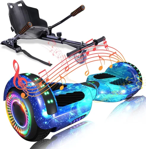 SIMATE Aeropatineta con combinación de accesorios de asiento, 6.5 pulgadas, autoequilibrante, con altavoces Bluetooth y luces LED para niños,