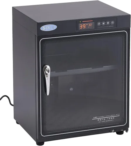 Sirui Gabinete de control de humedad HC50 - Sirui 6 años de garantía limitada Construcción: Caja: acero (0.04 pulgadas/0.040 in) de espesor. Puerta: vidrio templado Capacidad: 50L Dimensiones (alto x ancho x profundidad): 20,5 x 15,7 x 13,2" (520,70 x 398,78 x 335,28 mm) Peso: 28lbs (12.70kg)