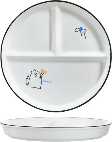 SOCOSY Plato de cerámica de control de porciones de 3 compartimentos, platos divididos para platos, plato de postre dividido, plato de ensalada, platos llanos para aperitivos, bandejas para servir aperitivos, 1 globo de gato de 8 pulgadas