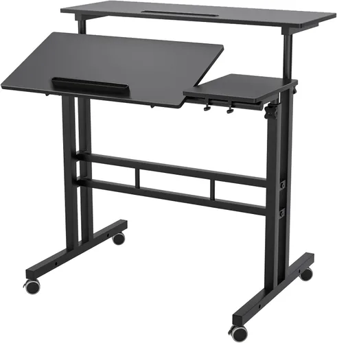 ▶Material del escritorio para computadora portátil: el carrito de mesa SogesHome está hecho de MDF de 0.591 in con acabado brillante que hace que sea fácil de limpiar. El material del marco es de metal resistente con recubrimiento en polvo que garantiza la estabilidad y durabilidad del escritorio del portátil. ▶Escritorio de computadora ajustable: dos escritorios son ajustables en diferentes o mismas alturas según tus necesidades. También una alfombrilla de mouse independiente es inclinable. Puedes trabajar en este escritorio de regazo ya sea de pie o sentado. ▶Diseño pragmático: un tablero de panel es inclinable según tus necesidades. Las repisas en el panel ayudan a evitar que tu computadora portátil se deslice. Fácil de mover o detener el escritorio de la computadora en todas partes con las ruedas con bloqueo. ▶Fácil de montar: tamaño de la mesa para portátil: 31.5 pulgadas de largo x 23.6 pulgadas de ancho x 27.6 pulgadas de alto. Tendrás este escritorio para computadora instalado rápidamente de acuerdo con las instrucciones. Todas las herramientas y accesorios están incluidos en el paquete del escritorio. Cualquier pregunta, no dude en contactarnos. ▶Escritorio multifuncional para portátil: úsalo como una estación de trabajo multifuncional, un escritorio de pie para el trabajo de oficina, un escritorio para el trabajo en casa, un soporte para portátil/tableta. Si hay algún problema cuando recibas el escritorio para laptop, no dudes en ponerte en contacto con nosotros, te responderemos en 24 horas.