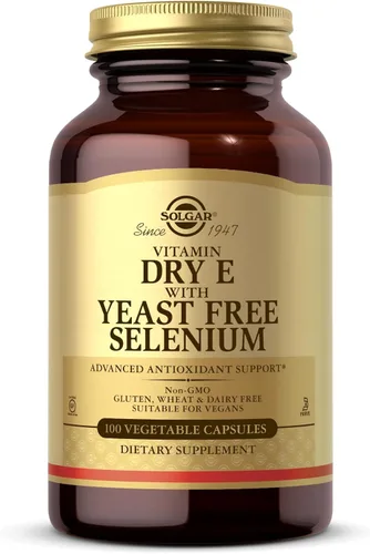 Forma no aceitosa; Esta formulación proporciona vitamina E natural en una forma seca (no aceitosa), para aquellos que tienen dificultad para digerir grasas y aceites. Con selenio sin levadura; Nuestra formulación combina vitamina E con el importante oligomineral Selenio. El selenio ayuda a combatir los radicales libres en el cuerpo y ahorra vitamina E, que a su vez apoya el sistema de defensa antioxidante de la célula. Suplemento conveniente; Esta formulación sinérgica y antioxidante se ofrece en una práctica cápsula vegetariana de dos piezas. Sin gluten, trigo ni lácteos; la vitamina E seca Solgar no es OMG, vegana, kosher y libre de: gluten, trigo, levadura, azúcar, sal, sabores artificiales, edulcorantes artificiales, conservantes artificiales y colores artificiales. El estándar oro; durante más de 75 años, Solgar se ha comprometido con la calidad, la salud y el bienestar. Nuestra misión es crear los mejores suplementos nutricionales en pequeños lotes, a través de una investigación incansable, utilizando solo las mejores materias primas