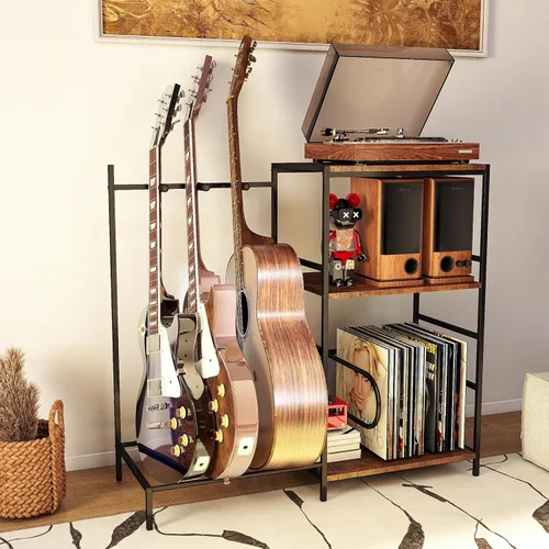 Soporte de guitarra para múltiples guitarras: sostenga diferentes insturments verticalmente, incluyendo guitarras acústicas, eléctricas, bajo, ukelele y banjo. Protección de espuma y tubos de metal resistentes: el soporte de guitarra Elerator garantiza la seguridad de tu instrumento. Para mantener mejor tu instrumento en una situación segura, el tubo de metal inferior del soporte para guitarra está cubierto por espuma suave, que no dejará marcas en tu instrumento y protege tus instrumentos de arañazos. Con estante de almacenamiento de 3 niveles: compuesto de metal de alta calidad y madera dura y gruesa. El estante de almacenamiento puede ayudarte a mantener el reproductor de discos de vinilo, discos de vinilo, álbumes, afinador de guitarra, amplificador de guitarra y accesorios de guitarra. Combinando el soporte de almacenamiento de 3 niveles, tiene dos opciones para instalar los soportes de guitarra. Más comodidad y disfrute. Montaje sin esfuerzo: las piezas preetiquetadas y las instrucciones claras en inglés permiten una configuración rápida de este sistema de almacenamiento de guitarra, no se necesitan herramientas adicionales. Superficies fáciles de limpiar: los estantes de madera recubiertos de melamina resisten la humedad y los arañazos (limpian con un paño húmedo). Los niveles de malla metálica abiertos minimizan la acumulación de polvo, asegurando un mantenimiento de bajo mantenimiento. Uso versátil: el estante de guitarra industrial vintage no solo es ideal para estudios de música, sino también como decoración del hogar para mostrar instrumentos. Es una gran adición personal o un regalo para entusiastas de la música en vacaciones como Navidad y día de San Valentín