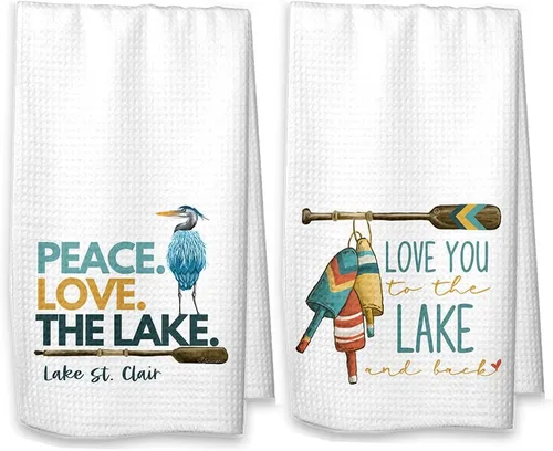 Juego de 2 toallas de cocina para gofres, personaliza Peace Love Lake con apellido, nombre del lago, est. fecha, etc. Regalo perfecto para el Día de la Madre, Día del Padre, regalo de anfitriona y mucho más