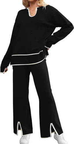 SuperPrity Conjunto de 2 piezas de suéter para mujer, con cuello de muesca, manga larga, suéter de punto y pierna ancha