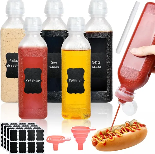 del contenido que reconoce fácilmente el condimento para una selección rápida, con bolígrafo blanco para escribir el nombre de salsa o condimento en la etiqueta negra, más fácil de distinguir., Diseño a prueba de fugas: estas botellas de salsa tienen una boquilla cruzada flexible de silicona y una tapa superior abatible, que puede controlar fácilmente el flujo de salsa líquida y a prueba de polvo, la tapa está unida a la tapa, no gotea, bloquea la salsa del contacto con el aire, manteniendo los condimentos frescos., El paquete contiene: en el paquete, recibirás 5 botellas exprimibles de condimentos de 16.9 onzas con 40 etiquetas de tiza negra, 2 embudos de silicona para ayudar a rellenar la botella y el marcador blanco, cualidades suficientes para satisfacer tu uso diario y almacenar variedad de salsas.