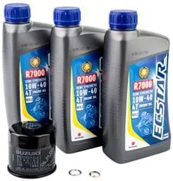 El kit de cambio de aceite incluye: 3 cuartos de aceite semisintético Suzuki ECSTAR R7000 10W-40. 1 filtro de aceite Suzuki OEM. 1 junta de drenaje de aceite OEM Suzuki.