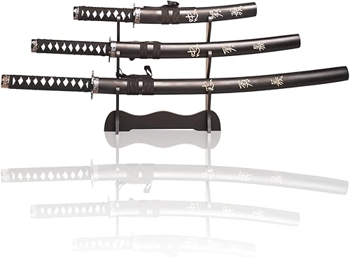 Sword Valley Authentic Hanakiri Samurai Sword 3-Piece Set with 3-Tier Display Stand - Dragon Engraved Scabbards, Stainless Steel Blades, Waxed