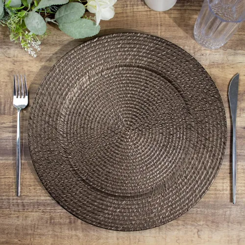 Placas de carga de ratán marrón natural Si estás buscando una manera elegante pero económica de actualizar tu evento o cena, no busques más que nuestros platos de cargador de ratán. Estos manteles individuales redondos desechables cuentan con un hermoso diseño de placa de mimbre que añade un toque de calidez y sofisticación a cualquier entorno. Nuestros platos son perfectos tanto para reuniones informales como formales, y harán que tus decoraciones parezcan que hiciste un esfuerzo adicional, sin quemar un agujero en tu bolsillo. Alfombrillas de mesa de plástico acrílico redondo marrón natural Los platos de mimbre son el suministro de catering perfecto para cualquier evento. Estos hermosos platos redondos desechables tienen un diseño clásico de mimbre que añade interés visual a cualquier mesa. También están diseñados pensando en la comodidad; son desechables, lo que hace que la limpieza después de la cena sea fácil. El material plástico ligero hace que sean fáciles de transportar y almacenar. Añade estos manteles individuales para añadir un toque exclusivo a cada lugar. Perfecto para baby showers, eventos corporativos, bodas u otras ocasiones especiales. ¡Haz que la presentación de tus creaciones culinarias sea excepcional con estos atractivos platos de mimbre para cargar! Manteles individuales desechables de color marrón natural rústico Transforma tu próxima cena en una noche para recordar con nuestros elegantes platos de mimbre cargadores. Combinando la belleza de los materiales naturales con la comodidad del ratán sintético, estos manteles de plástico son perfectos para añadir un toque de alta gama a cualquier comedor. Ya sea una reunión familiar íntima o una gran celebración, nuestros tapetes de ratán te darán la mejor experiencia gastronómica. Con su sutil paleta de colores y delicada textura, sirven como un sofisticado telón de fondo para acentos de mesa más coloridos como arreglos florales, platos decorativos y manteles ilustrados. Cada plato está hecho de plástico acrílico que es fácil de limpiar y no se rompe ni mancha con el tiempo. Asegúrese de que cada curso