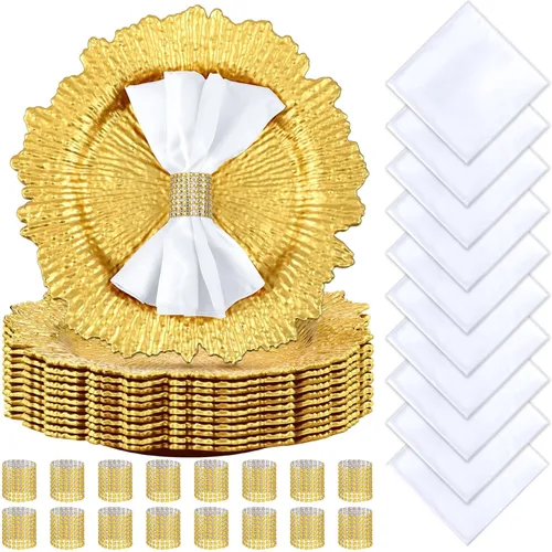 Juego de centros de mesa para boda: recibirás 24 centros de mesa florales de oro coral, 24 anillos para servilletas de diamantes en malla y 24 servilletas de tela blanca; La combinación ideal puede satisfacer tu necesidad diaria para una variedad de eventos festivos y hacer que tu mesa de boda se vea más exquisita Elegante decoración para mesa: estos juegos de platos de carga de color dorado están diseñados en un color magnífico, los platos de carga de plástico con diseño de borde tipo arrecife y forma clásica de copo de nieve, combinados con servilleteros tipo diamante y elegantes servilletas de tela sedosa, que son elegantes y atraen fácilmente la atención de los invitados Platos de carga para evitar derrames: nuestros platos de carga dorados de plástico miden aproximadamente 13 pulgadas de diámetro; Se ajustan bien debajo de varios platos de ensalada, platos principales, cuencos de sopa para evitar derrames y pueden decorar tu fiesta, proporcionando a los invitados una experiencia gastronómica agradable Amplia aplicación: nuestros cargadores de mesa de 13 pulgadas con anillos para servilletas y servilletas de tela son ideales para muchas ocasiones, adecuados para cenas formales, bodas, eventos, fiestas y otras ocasiones, decoran la mesa y crean una atmósfera; Los platos de carga también se pueden aplicar como adornos para decorar tu hogar Nota: los platos base de plástico no son aptos para microondas o lavavajillas; por favor lávalos con agua fría y límpialos con un paño húmedo para un uso prolongado, y son solo para fines decorativos, pero no para contacto directo con alimentos