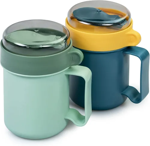 Recipientes de sopa para microondas: el juego consta de 2 tazones de sopa portátiles de 2 tonos (verde, amarillo/azul marino), 30-oz tazones de sopa portátiles con una tapa y diseño de mango de silicona. Ideal para calentar sopas, fideos ramen, bebidas calientes y más en el microondas. Material apto para alimentos: hecho de polipropileno ftalato y sin BPA para una experiencia segura para alimentos. Tapa de bloqueo giratorio y tenedor plegable: una tapa de bloqueo giratorio se bloquea de forma segura en la base para evitar derrames no deseados y atrapar el calor para mantener su comida caliente durante largos períodos de tiempo. La tapa consta de un compartimento que incluye un tenedor plegable. Despliegue y deslice el bloqueo sobre la junta para asegurarlo. Ventilación de liberación de vapor: la ventilación de liberación de vapor evita salpicaduras desordenadas de microondas. Retire la tapa del compartimento del tenedor y el spork para mantener la ventilación abierta al microondas. Apto para lavavajillas y congelador: seguro para usar en el estante superior de lavavajillas y almacenar las sobras en el refrigerador o congelador.