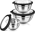 Cuencos de mezcla de calidad: nuestro juego de cuencos para mezclar está hecho de acero inoxidable de calidad de grado alimenticio de gran calibre, seguro y no retiene olores, para un uso duradero que es resistente y a la corrosión. Cada cuenco tiene un interior con acabado de espejo y exterior a prueba de huellas dactilares. Este hermoso y ordenado diseño de los cuencos para mezclar puede mejorar rápidamente tu placer de cocinar. Tapas coloridas resistentes y ajustadas: estos tazones para mezclar tienen 7 tapas coloridas en diferentes colores que son convenientes para que puedas identificar fácilmente la comida en el cuenco. Las tapas de los cuencos para mezclar son muy resistentes y duraderas, no tienen material sin bisfenol A, pero también no se deforman ni se deforman. Es ideal para el almacenamiento de alimentos y garantizar que la comida esté fresca en el refrigerador. Múltiples tamaños y accesorios prácticos: estos cuencos de acero inoxidable tienen 7 tamaños diferentes, incluyen 7, 6, 5, 4, 3, 2, 1.5 cuartos de galón. Complementarán tus diversos tipos de necesidades de cocina y ascensión tu experiencia de cocina. Accesorios de súper lujo, como espátula esparcidora, cepillo para untar, espátula, cuchara de espátula, batidor de huevos, separador de huevos y 6 cucharas de colores medidores. ons will a good hele por tu cocina. Ahorro de espacio y fácil de limpiar: los kits de 7 cuencos de acero inoxidable se pueden anidar sin problemas para que puedas ahorrar eficazmente el espacio de la cocina, lo que hace que la cocina esté más ordenada y limpia. Los tazones para mezclar son fáciles de limpiar a mano y sin dejar huellas dactilares. Nota: no utilices lavavajillas para limpiar las tapas de los tazones. Multiusos: estos kits de cuencos para mezclar son adecuados para múltiples escenarios de uso diferentes para la cocina, como hacer ensaladas, mezclar grandes masas, mezclar huevos, servir y almacenar alimentos, etc.