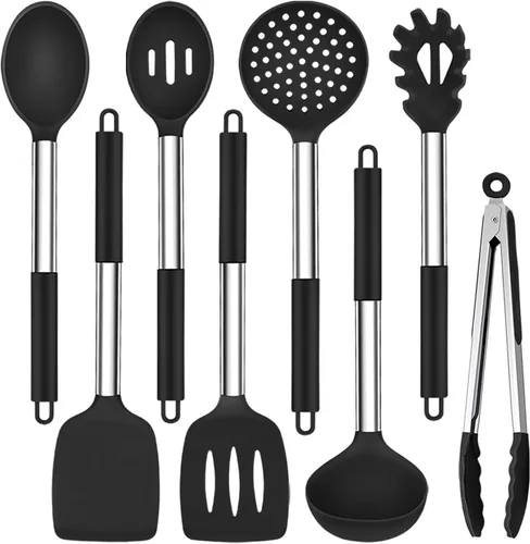 Silicona de grado alimenticio y mango de acero inoxidable: los utensilios de cocina TeamFar están hechos de silicona de grado alimenticio y acero inoxidable puro sin que ninguna sustancia tóxica se filtre en tus alimentos, el mango de acero inoxidable cubierto con funda de silicona para un mejor aislamiento y te proporciona un agarre cómodo, no se oxida, no se rompe, no se dobla y durará más tiempo A prueba de calor y antiarañazos: los utensilios de cocina de silicona pueden soportar altas temperaturas de hasta 446 °F (446.0 °F), no se derrite ni se deforma mientras cocinas, los cabezales de silicona suave protegen la superficie de la olla de arañazos y daños a diferencia de los utensilios de cocina de metal, prolongan la vida útil de tus utensilios de cocina de cocina Multiusos: este juego de herramientas de cocina viene en diferentes tamaños y formas para diferentes funciones, como freír, hornear, mezclar, voltear, escurrir y servir los platos, más económico y práctico, ideal para personas que aman cocinar en inauguración de la casa, cumpleaños, Navidad, Halloween, etc. Apto para lavavajillas y fácil almacenamiento: superficie de silicona lisa y antiadherente para facilitar la liberación de alimentos, diseño de una sola pieza sin costuras para que no haya residuos ocultos de alimentos, fácil de limpiar a mano y apto para lavavajillas para ahorrar trabajo y tiempo, cada herramienta con lazo para colgar fácilmente en orden y secarlas más rápido después del lavado, también se puede almacenar en tu soporte para utensilios para ahorrar espacio y mantener ordenado Kit de utensilios de cocina de 8 piezas: 8 utensilios de cocina incluidos: volteador sólido, volteador ranurado, cuchara sólida, cuchara ranurada, cuchara ranurada, cucharón de sopa, servidor de pasta, espumador, pinzas, satisface tus diversos tipos de necesidades de cocina de cocina, combinaciones flexibles utilizadas para deliciosos platos y te permiten disfrutar de la agradable experiencia de cocina