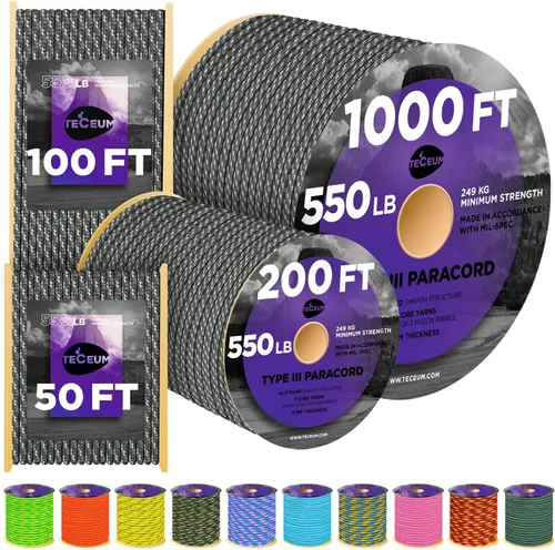 La nueva colección de cuerdas de paracaídas vibrantes y únicas cuenta con muchos colores camuflaje, neón, reflectantes y que brillan en la oscuridad. Cuerda de paracaídas 550: cuerda de paracaídas tipo III (550 libras) tiene un núcleo de nailon 100%. Color: Acu Digital. Longitud: 50 pies (15.2 m). Fabricado de acuerdo con MIL-SPEC. Disponible en 40 opciones de colores. Se envía según la longitud: 50, 100, 200 o 1000 pies. *Ten en cuenta que los colores pueden variar debido a las diferentes configuraciones del monitor Fuerte y duradera: la cuerda de paracaídas Paracord tipo III tiene 550 libras (249 kg) de fuerza mínima; una estructura de cubierta confeccionada con 32 hebras, 7 hilos de núcleo cada uno hecho de 3 fibras de nailon trenzadas. Grosor: 5/32 pulgadas (4mm). Fabricado según la certificación Mil-Spec C-5040H. Los materiales de alta calidad utilizados para fabricar nuestra cuerda de paracaídas la hacen duradera y resistente a los daños causados por las condiciones climáticas. Ya sea bajo el sol, la lluvia o la nieve, está hecha para servirte por mucho tiempo. Resistente a los rayos ultravioleta y a la decoloración Multiusos: versátil, flexible y de gran resistencia, esta cuerda de paracaídas es multifuncional. Se utiliza como cuerda de tienda para instalar tiendas de campaña, asegurar la hamaca o colgar artículos pesados como bicicletas y kayaks en tu garaje o sótano. Sirve como cuerda de seguridad en situaciones de emergencia. Ideal para hacer accesorios personalizados: cordones, pulseras, collares de perro, llaveros, cinturones, envolturas para hachas, cuchillos, herramientas y otros proyectos de bricolaje Imprescindible: elemento imprescindible para ir de campamento, senderismo, pesca, canotaje, kayak, otras actividades al aire libre y deportes extremos. El mejor regalo para hombres y mujeres que aman los deportes, actividades al aire libre y proyectos de manualidades, para niños y niñas exploradores. Equipo y accesorios de viaje, artículos de uso diario (EDC).