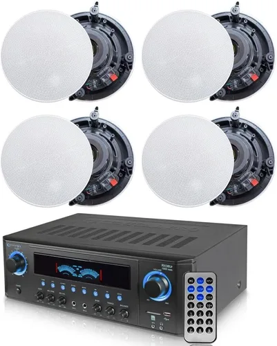 Potencia máxima de 1000 vatios: El receptor estéreo para sistema de cine en casa le da 1000 vatios de potencia máxima con 120W RMS para un audio amplificado de alta calidad. Perfecto para karaoke y sistema de sonido envolvente acústico de cine en casa Diseño de montaje empotrado: 2 pares de altavoces de sonido estéreo de bajo medio bajo de diseño de montaje empotrado para una instalación simple y fácil en la pared y en el techo. El producto cuenta con bobina de voz de alta temperatura de 1 pulgada para producir un sonido potente y rico o música de fondo silenciosa CONTROLES DE EQ: El dispositivo de amplificación de sonido del altavoz tiene botones nítidos para las fuentes y selectores de audio, perilla giratoria para ecualización y ajustes de volumen maestro. También cuenta con botones y perillas iluminados por LED azules para una alta visibilidad ALTAVOZ DE MONTAJE DE 2 VÍAS: El 2 pares de altavoces de sonido estéreo de alto rendimiento de 5.25 pulgadas tiene dos formas de instalación: montaje empotrado en pared o en techo. Tiene prácticos terminales de altavoz que permiten una conexión rápida y sin complicaciones de cables de altavoz en cualquier instalación personalizada