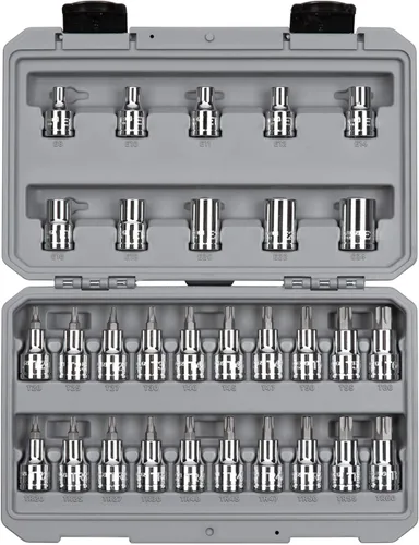 Incluye 10 unidades. 1/2 pulg Tomas de bits Torx de la unidad: T20, T25, T27, T30, T40, T45, T47, T50, T55, T60; 10-pc. 1/2 pulg zócalos Torx resistentes a la manipulación de la unidad: TR20, TR25, TR27, TR30, TR40, TR45, TR47, TR50, TR55, TR60; 10 piezas. 1/2 pulg unidad de enchufes estrella externos: E8, E10, E11, E12, E14, E16, E18, E20, E22, E24; Estuche de almacenamiento La broca de acero S2 se ajusta a presión en el zócalo para una conexión recta y permanente que no se puede aflojar con el tiempo La broca Torx en forma de estrella tiene 6 lóbulos; las brocas Torx resistentes a manipulaciones tienen un centro hueco para acomodar el poste en los sujetadores TR Sujetadores externos Star (hembra) de 6 lóbulos diseñados para un ajuste de alto par con sujetadores E-Star Las grandes marcas de tamaño troqueladas son fáciles de leer y no pueden desgastarse Cuatro ranuras de retención proporcionan una conexión segura con la herramienta de accionamiento Acabado pulido, cromado fácil de limpiar y es altamente resistente a la corrosión