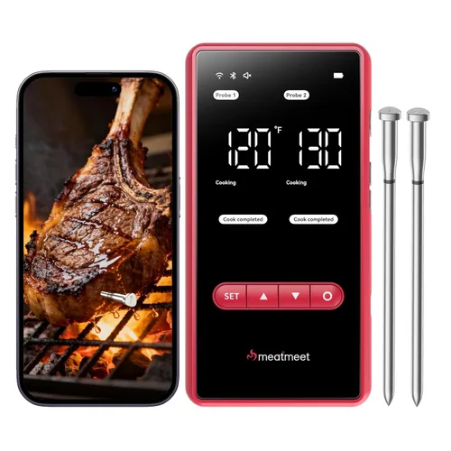Conexión dual estable, rango ilimitado: este termómetro inalámbrico para carne cuenta con conectividad Wi-Fi y Bluetooth alimentada por un avanzado procesador de doble núcleo para una señal más fuerte y rápida. Ya sea que estés junto a la parrilla o dentro de la cocina, disfrutarás de un monitoreo estable y en tiempo real sin interrupciones, ideal para barbacoas, ahumadores y hornos Precisión como un profesional: cada sonda de carne incluye 6 sensores incorporados, 5 internos y 1 ambiental, proporcionando lecturas ultra precisas de hasta ±0.18°F. Obtén un seguimiento preciso de la temperatura para lograr la cocción perfecta cada vez, ya sea que lo uses como termómetro de cocina para carne, pollo o pecho de res Inicio rápido, no se necesita cuenta: no hay registro, no inicio de sesión, no se requiere información personal. Simplemente encienda la base del termómetro digital para carne, inserte las sondas y comience a cocinar de inmediato. ¿Quieres control remoto? Conéctate a la aplicación Meatmeet en cualquier momento para comprobar las temperaturas en vivo desde cualquier lugar Batería de larga duración y carga rápida: nunca vuelva a pausar su barbacoa. Solo 5 minutos de carga proporcionan hasta 10 horas de cocina; una carga completa de 30 minutos ofrece hasta 30 horas de uso. La base dura hasta 36 horas, perfecta para asados de todo el fin de semana y largas sesiones de ahumado IP69 impermeable y fácil de limpiar: construido para manejar condiciones reales de cocina, este termómetro de cocina inalámbrico es totalmente resistente al agua IP69. Enjuágalo con agua corriente o colócalo en el lavavajillas, sin preocupaciones, sin ensuciar. Duradero, apto para alimentos y fácil de mantener para la cocina diaria Dos sondas para cocinar múltiples platos: Monitorea dos platos a la vez con dos sondas de carne ultra delgadas. Realice un seguimiento de ambas temperaturas simultáneamente, cada una con sus propias alertas objetivo. Ideal para cocinar diferentes carnes o acompañamientos en diferentes niveles de cocción Regalo perfecto para los amantes de la comida: el termómetro de carne Meatmeet X Pro combina un elegante diseño de acero inoxidable, alta precisión y características inteligentes que impresionan a los entusiastas de la barbacoa y a los chefs caseros por igual. Un regalo considerado para cumpleaños, días festivos o cualquier ocasión de asado Atención al Cliente y Garantía Dedicadas: Disfruta de tranquilidad con una garantía completa de un año y un servicio al cliente receptivo. ¿Preguntas? Te respaldamos para que puedas cocinar con confianza con tu nuevo termómetro inalámbrico para carne