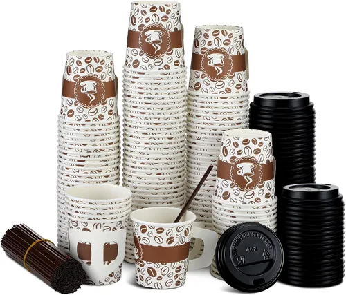 Paquete económico para ti: el paquete incluye 200 juegos de tazas de café desechables con tapas, asas y pajitas, principalmente en color café, clásico y elegante; la cantidad suficiente puede cubrir completamente tus demandas de uso diario y de fiesta Diseño de mango cuidadoso: estas pequeñas tazas desechables de espresso miden aproximadamente 4 onzas de capacidad, y las asas cuidadosas hacen que estas tazas sean agradables tanto para agua caliente como fría, y no te preocupes por que el agua caliente se queme, te permiten disfrutar del café fácilmente Uso con confianza: estas pequeñas tazas de café están hechas de material de papel de calidad, sin un olor acre, sólido y a prueba de fugas; además, las tapas y pajitas equipadas están hechas de plástico, lo suficientemente fuerte contra roturas, deformaciones y fracturas Ahorro de tiempo y energía: ya sea aplicado en la cocina o fiestas, estos vasos desechables de papel espresso se pueden tirar después de celebraciones, lo que puede ahorrar muchos problemas en tu vida; además, estas tazas desechables se pueden aplicar ampliamente para café, té, cacao, jugo, cóctel, helado, bebidas, etc Versátiles de usar: estas tazas de espresso apilables son muy adecuadas para fiestas de Navidad, celebraciones, graduaciones, bodas, fiestas de cumpleaños, oficina, reuniones familiares, barbacoas, bufés, caterings, banquetes, actividades de negocios, restaurantes y otros lugares, ideal para muestras de bebidas públicas y privadas