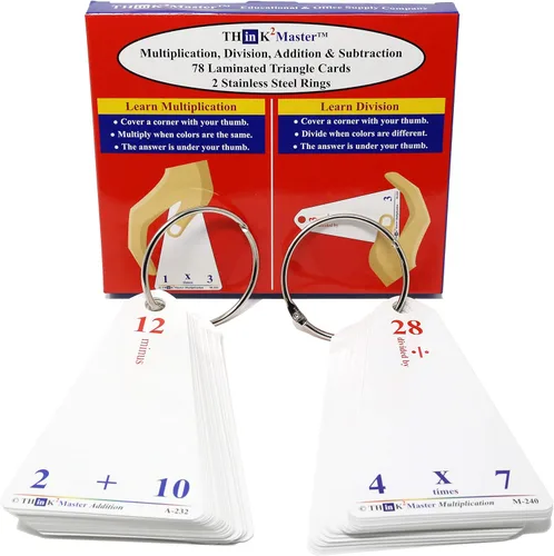 | Nombre del producto | Think2Master Tarjetas flash triangulares de suma y resta de multiplicación laminada premium 78 tarjetas flash borrables en seco. Incluye 2 anillos. |