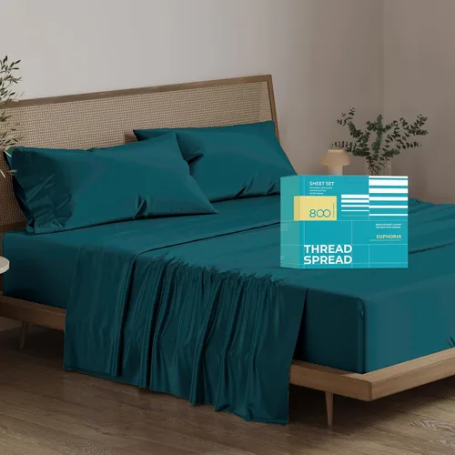 Lujoso juego de sábanas de hotel de cinco estrellas 100% algodón egipcio: hecho de 100% algodón egipcio de fibra extra larga, nuestros juegos de sábanas son más suaves y duraderos para una mejor felpa. Las sábanas de algodón de 800 hilos son suaves y sedosas con un rico tejido de satén que añade un toque luminoso a la ropa de cama. Son pesados, refrescantes y transpirables para el máximo lujo de hotel de cinco estrellas y comodidad para todas las estaciones ¿Qué viene en el conjunto? : Nuestro juego de sábanas tamaño California King de color verde azulado tiene 4 piezas: 1 sábana encimera (108 pulgadas de ancho x 102 pulgadas de largo), 1 sábana bajera ajustable (72 pulgadas de ancho x 84 pulgadas de largo + 16 pulgadas) y 2 fundas de almohada tamaño King (21 pulgadas de ancho x 41 pulgadas de largo). La sábana bajera tiene bolsillos profundos para adaptarse a colchones ajustables de 8 a 16 pulgadas de profundidad. Las etiquetas inteligentes para la cabeza/pie te ayudan a hacer la cama fácilmente. Combina estas sábanas de la colección de hotel con un edredón y una funda de edredón a juego para elevar la decoración del hogar/habitación Seguro para ti y tu familia: el algodón es de origen natural y respetuoso con el medio ambiente, a diferencia de la microfibra y otras sábanas que no son ideales para tu salud y piel. En Thread Spread, nos centramos en una vida saludable y de calidad, y nuestras sábanas de lujo están certificadas como estándar 100 de OEKO-TEX para estar libres de sustancias nocivas Instrucciones de cuidado: Thread Spread recomienda lavar las sábanas al menos una vez a la semana. Puedes secar en secadora o colgar las sábanas afuera para secar. Estas sábanas 100% algodón son resistentes al encogimiento, decoloración y pelusas. La tela se abre en unos pocos lavados y se vuelve más suave y lisa. Retira estas sábanas de lujo de la secadora tan pronto como termine el ciclo para evitar arrugas Te importa más: estamos seguros de que te encantarán nuestras sábanas de algodón egipcio. En caso de que no estés satisfecho con la compra, tenemos una política de devolución/reembolso flexible para que los artículos se intercambien o reembolsen. También puedes regalar nuestras mejores sábanas de algodón egipcio a tus seres queridos en el Día de la Madre, Día del Padre, Día de la Mujer, Día del Hombre, Navidad, Día de San Valentín, Halloween, bodas, vacaciones y vacaciones de otoño