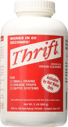 Este producto es muy duradero Este producto añade un gran valor Este producto se fabrica en Estados Unidos THRIFT funciona en desagües, líneas de alcantarillado, trampas de grasa y sistemas sépticos. THRIFT limpiará una línea de drenaje en menos de 60 segundos! THRIFT Es seguro de usar en la mayoría de superficies de cocina o inodoros.