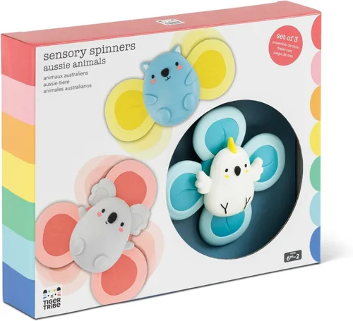 "SENSORY SPINNER: ANIMALES AUSSIE: un atractivo juguete sensorial de tres piezas para tocar, explorar, sonajear, masticar y girar! Juego de 3 hilanderos. Diseñado para fomentar las habilidades motoras finas, el juego sensorial y el aprendizaje de causa y efecto en bebés y niños pequeños, los Spinners sensoriales cuentan con un trío de lindos animales australianos cada uno con un spinner de dos, tres o cuatro palas. Los contornos y texturas animan a las manos pequeñas a explorar y tocar. Una fuerte ventosa detrás de cada animal permite una fácil fijación a cualquier superficie lisa no porosa (piense en bañeras, azulejos, sillas altas, espejos, neveras y ventanas de automóviles). El spinner se pega firmemente permitiendo giros súper estables y juego independiente. Escucha el sonido del traqueteo también. Regalo divertido y atractivo para baby shower. Fomenta el juego sensorial, las habilidades motoras finas y el aprendizaje causa-efecto. Hecho de combinación de TPE y HIPS (sin ftalatos, PVC, cadmio, BPA y plomo). Fuerte ventosa que permite una fácil fijación a superficies lisas. Ideal para niños de 6 meses a 2 años. Incluye 3 hilanderos de animales australianos (Cockatoo, Koala y Wombat) TIGER TRIBE: Nuestra misión - Somos una marca australiana liderada por el diseño que crea regalos que nutren la confianza y la creatividad en los niños