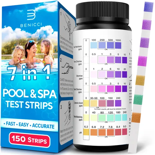 KIT DE PRUEBA PARA PISCINA - Todo lo que necesitas en 1 tira. Estas tiras de kit de prueba de piscina 7 en 1 están diseñadas para medir con precisión una variedad de parámetros, incluyendo cloro libre y total, dureza total, pH, alcalinidad total, ácido cianúrico y bromo libre. TIRAS DE PRUEBA PARA PISCINA - Un imprescindible para propietarios de piscinas. Las tiras de nuestro kit de prueba química para piscina son altamente precisas y confiables, garantizando una experiencia sin preocupaciones con el agua de tu piscina, jacuzzi y spa. Mantén tu agua saludable, limpia y agradable todo el tiempo. TIRAS REACTIVAS PARA SPA - Mantenimiento de agua más fácil - Estas prácticas tiras de prueba para piscinas están diseñadas para ayudarte a mantener de manera sencilla y segura, y a monitorear las condiciones del agua en tus piscinas enterradas y elevadas, bañeras de hidromasaje, jacuzzi o spa. TIRAS DE PRUEBA PARA SPA Y JACUZZI - Resultados altamente precisos en segundos. Con nuestras tiras de prueba para agua de jacuzzi, no hay necesidad de esperar. Sumerja la tira en agua durante 2 segundos, sáquela y espere 15 segundos para obtener resultados precisos. ¡Monitorea la calidad de tu agua en cualquier momento que quieras! Tiras de prueba de piscina para piscina sobre el suelo: valor perfecto para tu dinero. Olvídate de comprar tiras de pH que cuestan una fortuna. Con cada compra, obtienes 150 tiras de prueba de calidad del agua para piscina para pruebas regulares de agua.