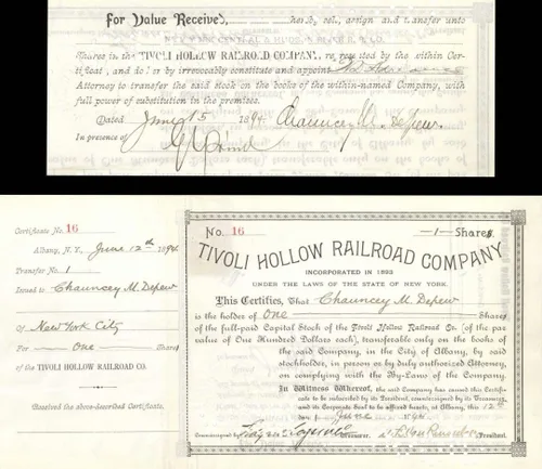 Tivoli Hollow Railroad Co. Issued to and Signed by Chauncey M. Depew - 1894 dated Autographed Stock Certificate