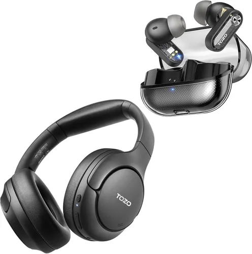 Cancelación de ruido ANC y ENC: con un algoritmo ANC híbrido y 3 micrófonos ANC, TOZO HT2 ofrece un control de ruido excepcional en un amplio rango de frecuencias. Ya sea el rugido de los motores de avión, el ruido del metro o la charla de oficina, minimiza eficazmente la interferencia de ruido, asegurando una experiencia auditiva sin igual. Además, la excelente cancelación de ruido de llamadas ENC le permite hablar claramente incluso en calles ruidosas. [Hasta 60 horas de tiempo de reproducción] Con hasta 60 horas de tiempo de escucha de nuestros auriculares sobre la oreja en modo ANC OFF, el triple que otros auriculares Bluetooth. Una sola carga te da suficiente jugo para escuchar más de 900 canciones o banda sonora de múltiples vuelos de larga distancia. También está equipado con un cable de audio de 0.138 in, puede pasar sin esfuerzo a un modo con cable cuando la batería se ha agotado, lo que garantiza una escucha ininterrumpida. Cancelación activa de ruido híbrida: con una profundidad máxima de reducción de ruido de 38 dB, puedes perderte en tus canciones favoritas sin distracciones del mundo exterior. [Sonido estéreo inmersivo] Las cápsulas de cristal TOZO tienen controladores de gran tamaño de 0.394 in y una exclusiva tecnología de sonido OrigX Acoustic 2.0 que ofrece graves potentes y agudos delicados, lo que te lleva a una fiesta musical inmersiva.