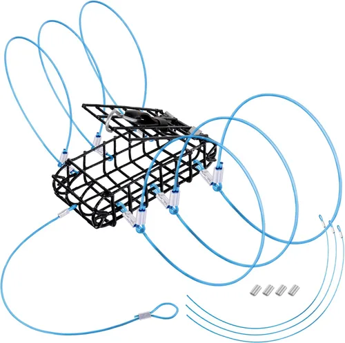 Tamaño: jaula de cebo de 4.1 x 1.9 x 1 pulgada, 1 PIEZA. Material: La jaula de cebo de forma rectangular está fabricada en acero galvanizado, cuenta con revestimiento de vinilo, que puede mantenerse en un entorno de agua salada. Y con los bucles fuertes, sostenga los cangrejos y no sueltos. Ventajas: Las 6 asas azules están orientadas hacia arriba, de esta manera, es más probable que la pinza del cangrejo se enganche en la trampa. Diseñado para cangrejo Dungeness, cangrejo azul, cangrejo rojo, cangrejo de roca y así sucesivamente. También apropiado para la pesca de cangrejos en muelles. Se puede lanzar con una caña de pescar.