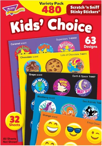 CELEBRAR Y MOTIVAR - ¡Las calcomanías Stinky han sido una recompensa favorita durante 40 años! Diversión para coleccionar, comerciar y celebrar logros y ocasiones especiales. Rasca y olfatea una y otra vez: la divertida obra de arte y el aroma vívido traen alegría a niños y adultos por igual. Recuerdos de fiesta y manualidades creativas: añade calcomanías a los sobres de invitación; corta las hojas para repartir para Halloween, en bolsas de golosinas y regalos de anfitriona. ¡Crea un gran impacto en los diarios con viñetas! ¡Ideal para proyectos de arte, coronas de cumpleaños y envoltura de regalos para un atractivo extrasensorial! Gran valor: 94 diseños diferentes en 30 hojas; 483 calcomanías en total. 12 aromas incluidos. La mayoría de las pegatinas miden de 7/8" a 1" de diámetro. Las hojas miden 4-1/8 x 5-7/8 pulgadas. ¡QUÉ SELECCIÓN! - Los diseños incluyen Picnic, Crayones, Burbujas, Animales marinos, Caramelos de menta, Granja, Hora de la escuela, Sol y diversión, Deportes, Expresiones de excelencia, Dulces deliciosos, Flores y Gran cumpleaños. Calidad y seguridad: las calcomanías de TREND superan todos los estándares de seguridad de productos para niños y se prueban de forma rutinaria. No son tóxicos y no están fabricados con aceites de nueces. Libre de ácidos para ser utilizado con fotos y álbumes de recortes. Diseñado y fabricado en los Estados Unidos. Diseñado para niños de 3 años en adelante.