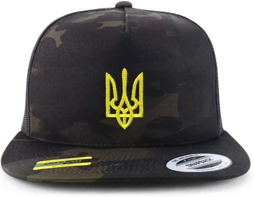 Trendy Apparel Shop - Gorra de camionero con símbolo nacional ucraniano bordado inglés antiguo de 5 paneles. 47 % algodón, 28 % nailon, 25 % poliéster. Bordado personalizado de alta calidad en Estados Unidos. Marca Flexfit Snapback. 5 paneles, corona estructurada con hilo blanco para resaltar el diseño antiguo de la fuente inglesa. Visera plana estilo camionero parte trasera de malla para circulación de aire fresco. Cierre a presión de plástico. Talla única.
