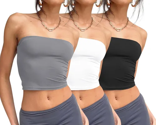 Trendy Queen Paquete de 3 camisetas de tubo para mujer, sin tirantes, básicas, sin espalda, brasier bandeau sólido, trajes de verano
