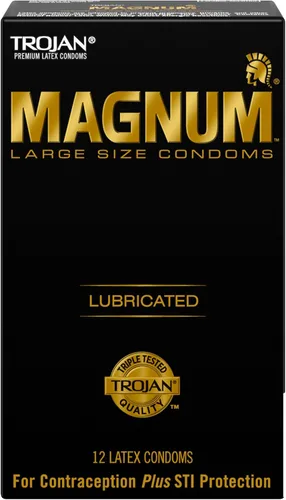 Una caja de 12 unidades de condones TROJAN Magnum de tamaño grande Los condones TROJAN Magnum de tamaño grande son más grandes que el condón normal y vienen con una base cónica que se mantiene firmemente en su lugar - El estándar de oro en comodidad y protección Estos condones TROJAN están diseñados con un extremo de depósito especial para mayor seguridad y un lubricante suave y sedoso que garantiza mayor comodidad y sensibilidad Condones de látex de alta calidad para hombres que ayudan a reducir el riesgo de embarazo no deseado e infecciones de transmisión sexual (ITS) No aceptes sustitutos
