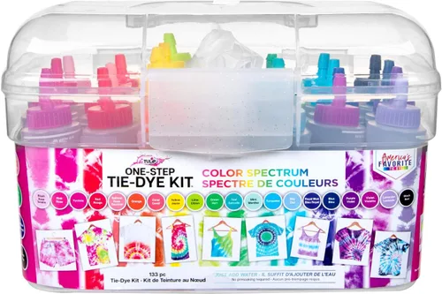 Obtén la mejor experiencia de teñido anudado con cada color del arco iris en el kit de teñido anudado de un solo paso Tulip Color Spectrum Suministrado con 66 onzas de tinte de un solo paso en una paleta de arco iris extendida imprescindible: 24 (2.75 oz.) botellas de tinte (rubor, rosa, fucsia, rojo, salmón, naranja, coral, amarillo, lima, verde, verde azulado, menta, turquesa, cielo, azul real, azul, morado, violeta, lavanda y negro), además de guantes, bandas de goma, una cubierta de superficie reutilizable y una guía de proyectos. Este kit también viene en un recipiente de almacenamiento de plástico reutilizable para guardar tintes y otros artículos cuando la diversión del teñido anudado está lista. Añade un color audaz a tu armario con vibrantes looks de teñido anudado que puedes mezclar y combinar. Ideal para actividades grupales y regalos también