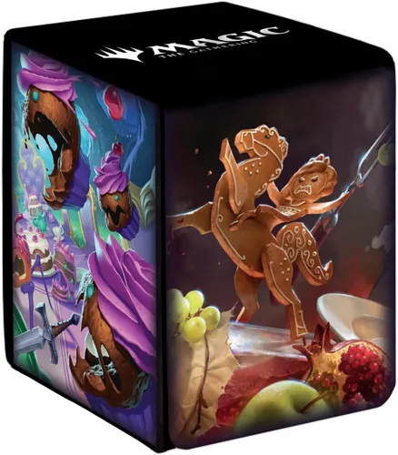 Caja de almacenamiento de cartas con licencia oficial para Magic: The Gathering Wilds of Eldraine Cuenta con ilustraciones vibrantes a todo color de varias promociones de Food Fight en todos los lados Capacidad para hasta 100 tarjetas de tamaño estándar de doble manga e incluye un divisor de mazo Fabricado con materiales de polipropileno rígidos seguros para un almacenamiento seguro Caja de cartas MTG para tarjetas coleccionables MTG, tarjetas de D&D, tarjetas de juego