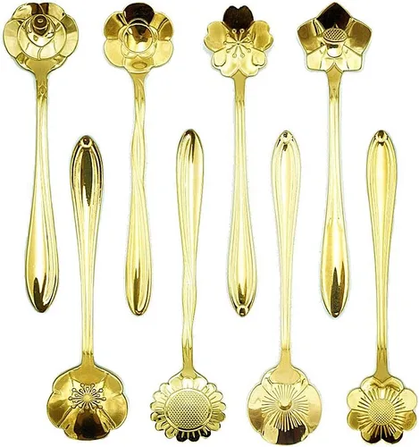 8 diferentes patrones de flores doradas de cuchara de helado, cuchara de café, cuchara de té Fabricado con el mejor acero inoxidable Simple y elegante con pulido de espejo Apto para lavavajillas Incluye: cuchara de rosa: 1, cuchara Sakura: 1, cuchara de girasol: 1, cuchara de flores de globo: 1, cuchara de flores cosmos: 1, cuchara de flor de ciruela: 1 cuchara de flor de sol: 1 cuchara de flor de pensamiento: 1
