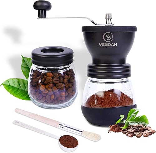 VenDan - Molino de café manual - Molino de café con manivela con tarro de viaje - Molino de granos de café - Incluye cuchara de café y cepillo