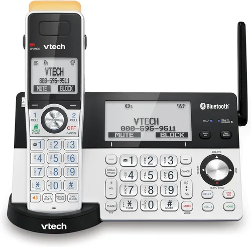 Alcance súper largo de hasta 2300 pies - Experimenta lo mejor en cobertura y claridad con nuestro teléfono inalámbrico. Su diseño único de antena y los avances en tecnología de filtrado de ruido garantizan un rendimiento óptimo. Con más de 2000 pies de alcance, puedes mantenerte conectado en una llamada en cualquier lugar de tu hogar, patio o incluso en la casa de tu vecino. 【BLOQUEADOR DE LLAMADAS INTELIGENTE Y ANUNCIO DE IDENTIFICACIÓN DE LLAMADAS】– Ofrece bloqueo de llamadas con un solo toque para las llamadas molestas. Filtra las llamadas automáticas y las llamadas no deseadas mientras permite que lleguen llamadas importantes. Puedes configurarlo para solicitar a las personas que llaman desconocidas que graben sus nombres y presionen la tecla numeral, y el teléfono anunciará el nombre de la persona que llama cuando suene. Puede optar por bloquear, responder o reenviar la llamada al sistema de contestación. Conexión Bluetooth al celular - Conecta tu plan celular a la comodidad de un teléfono doméstico. Empareja hasta 2 teléfonos celulares para llamadas de línea fija o conecta un teléfono celular y un auricular Bluetooth. Disfrute de los beneficios del teléfono inteligente con un toque de botón. Accede a Siri, S Voice o Google Now desde teléfonos inalámbricos, incluso si tu teléfono está en otra habitación. Realice llamadas, escuche y responda mensajes de texto con voz y realice otras acciones de servicio. Sistema de respuesta digital con guía de voz: este sistema inalámbrico incluye una contestadora digital que tiene un contador de mensajes LED, y graba hasta 22 minutos de mensajes entrantes, anuncios salientes y notas. Una guía de voz integrada puede ayudarlo a configurar el sistema fácilmente. [Pantallas grandes, texto grande, teclado iluminado] - El teléfono inalámbrico VTech cuenta con pantallas grandes y texto grande para una fácil legibilidad. El auricular tiene una pantalla extra grande de 2 pulgadas, mientras que la base tiene una pantalla de 3,5 pulgadas, que muestra claramente la identificación de llamadas entrantes y los registros del historial de llamadas. La fuente ampliada y el teclado iluminado en el auricular facilitan la marcación sin esfuerzo, incluso en entornos con poca luz. Esto es particularmente beneficioso para las personas con discapacidad visual. [ANUNCIO DE IDENTIFICACIÓN DE LLAMADAS] - El auricular y la base anuncian el nombre de la persona que llama, por lo que no tienes que apresurarte a buscar el auricular para ver quién está llamando. Ampliable hasta 12 auriculares (utiliza el auricular accesorio IS8101). Para adaptarse a la comodidad de los usuarios en las llamadas, puedes guardar hasta 50 nombres y números en el historial de llamadas. [ALTAVOZ DE DÚPLEX COMPLETO Y AGENDA TELEFÓNICA] – Admite hasta 200 nombres y números en la agenda telefónica más 4000 entradas de agenda telefónica celular compartida para ti. Puedes disfrutar del altavoz completo dúplex en el auricular y la base y el intercomunicador entre auriculares y unidad base
