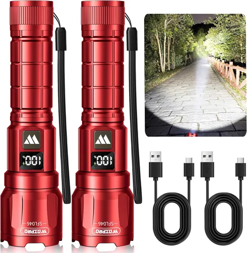 WdtPro Linterna LED Recargable, Paquete de 2, Linterna Táctica Súper Brillante con Zoom de 6000 Lúmenes con Pantalla Digital LCD, Linterna