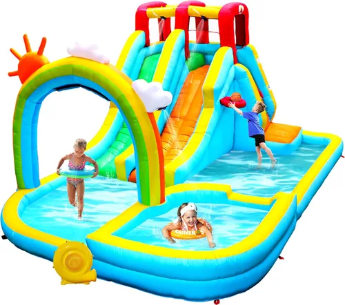 Material duradero: el parque hinchable del castillo está hecho de no tóxico, inodoro, está hecho de fibras de poliéster duraderas y resistentes con costuras dobles y forro de doble capa para garantizar la estabilidad y durabilidad. Está diseñado con colores brillantes según las características de los niños, atrayendo a niños y niñas Diseño científico: dispersa la presión excesiva sobre la tela del castillo hinchable y reduce la enorme fuerza de impacto al jugar. Cada niño puede experimentar y conquistar este divertido tobogán acuático con confianza y seguridad Varias formas de jugar: con 2 toboganes combinados, piscinas profundas, deportes de escalada y tiro, con sol, nubes blancas y arcos de cortina de agua arcoíris, para maximizar el entusiasmo de los niños por participar. El colorido color del castillo hace que los niños sean abrazados por un maravilloso mundo de cuento de hadas Instalación rápida: Conecte fácilmente con cualquier manguera de jardín. Se puede inflar y desinflar rápidamente en menos de dos minutos, y se puede plegar fácilmente para un fácil transporte y almacenamiento. El soplador de 110-120 V proporciona un flujo de aire continuo para una máxima seguridad y comodidad. Equipado con estacas para mantener el parque en un estado seguro Tamaño grande: el castillo hinchable tiene un tamaño que puede acomodar a toda la familia y es adecuado para niños aventureros. Esto es como un mundo de cuento de hadas de ensueño, y tal vez haya una extraña experiencia de Alicia en el país de las maravillas, tiene buena elasticidad