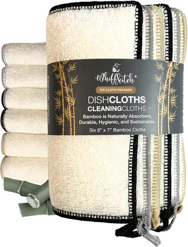 Whiffkitch Paños de cocina Trapos de cocina para Cocina y Limpieza 6x7 pulgadas (Paquete de 6) – Estos paños de cocina proporcionan un paño de limpieza económico y sostenible diseñado para platos y otros usos en y alrededor de la cocina. Los estropajos Whiffkitch son súper absorbentes y perfectos para limpiar derrames y suciedad de todo tipo. Su distintivo tejido de 2 capas crea una textura única de fregado sin arañazos, lo que los hace seguros de usar en sartenes antiadherentes, superficies de acero inoxidable, cristalería y electrodomésticos. Y aunque son lo suficientemente suaves para usar en superficies delicadas, son lo suficientemente duraderas como para soportar meses de uso riguroso. Cada paño está recortado con ribetes resistentes para mejorar la limpieza de los lugares difíciles de alcanzar, evitar que se deshilachen y mantener su forma incluso después de múltiples lavados. Para mantenerlas funcionando en su mejor estado, enjuaga y escurre después de cada uso, y deja secar al aire. Lavar a máquina regularmente con jabón para ropa. Las manchas difíciles generalmente se pueden eliminar con blanqueador de oxígeno o cloro ligero, pero el uso regular o excesivo de blanqueador puede degradar las fibras naturales del paño de cocina. Estos paños de cocina están hechos de rayón derivado de bambú (90%) y adornados con ribetes de poliéster (10%) para todas las superficies de tu cocina.