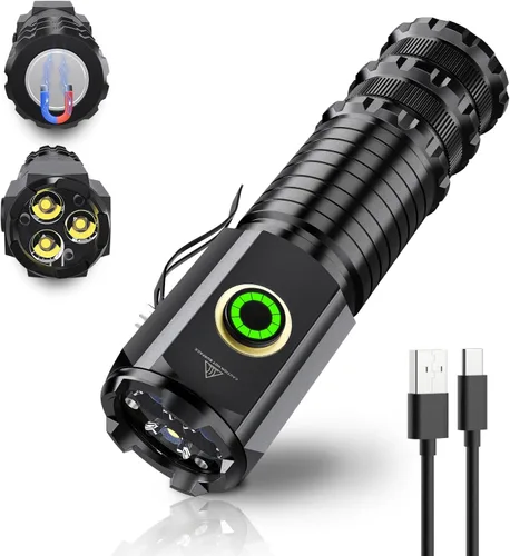 Linternas led pequeñas: Nuevos chips de iluminación led de loto de 3 piezas, mejoran drásticamente la disipación de calor y el brillo del led, admiten fuente de alimentación de alta capacidad y alta corriente. La linterna recargable de alto lúmen Wind&Moon es la mejor linterna de emergencia para el hogar, revisión del trabajo, aventura al aire libre, pesca, camping, senderismo, caminata nocturna, paseos con el perro y corte de energía. 5 modos y resistente al agua IPX5: La linterna táctica recargable Mini LED tiene 5 modos de iluminación: luz fuerte - luz media - luz baja - doble clic para flash ráfaga - mantener presionado tres segundos para flash ráfaga. El aluminio de grado aeronáutico de alta resistencia y el anillo de sellado de goma mejoran aún más la fiabilidad y durabilidad de la linterna, con un rendimiento impermeable IPX5, se puede utilizar en días lluviosos, ambientes húmedos o en contacto con el agua. Base magnética fuerte y clip portátil: nuestra linterna magnética es compacta y fácil de llevar. La fuerte base magnética en el extremo de la linterna recargable se puede fijar a cualquier superficie de metal para una iluminación estable y conveniente. La linterna táctica también viene con un clip de metal que se puede enganchar a tu cinturón, borde del bolsillo, correas de la mochila o sombrero, liberando así completamente tus manos para hacer otras cosas Reutilizable y recargable inteligente: la potente batería recargable de linterna de bolsillo de 2200 mAh es reutilizable y lista para cargar para el próximo uso. La pantalla inteligente muestra el color rojo para el estado de carga y el color verde para el estado completo. Entrada: tipo C; Salida: USB (se puede cargar por cualquier puerto USB). La linterna de modo más bajo funciona hasta más de 36 horas a plena capacidad. LO QUE OBTENDRÁS: 1 linterna táctica, 1 batería recargable de 2200 mAh, 1 cable USB-C, 1 manual de usuario, garantía de 24 meses.