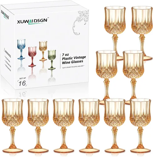 Paquete de 16: Recibirá 16 copas vintage de 7oz, suficientes copas para entretener a los invitados en casa y celebrar con estilo retro Este hermoso juego de copas de vino añadirá un toque elegante a tu mesa. Nota: No es adecuado para hervir líquidos calientes, uso en lavavajillas o microondas. Consulte la imagen principal para comparar el tamaño del producto con la botella de vino tinto. Textura de cristal: El vaso de agua con diseño de textura de cristal se ve brillante, no solo hermoso y duradero, sino también muy novedoso en diseño, lleno de misterio y fantasía en los cambios de color, es muy atractivo para poner en la mesa del comedor. Estos vasos de vino brillan al sol. Diseño verdadero de ámbar: Diferente de otras copas de vino de ámbar, nuestra copa de vino de ámbar es de ámbar verdadero, y el color ámbar es parte de la copa de vino. El diseño de patas altas hace que sea más fácil de sostener y beber de manera más conveniente. Resistente: Hecho de plástico de alta calidad, materiales de alta calidad crean lustre y brillo, añaden un aspecto vintage sin parecer barato, resistente y duradero, adecuado para bebidas frías. La pared interior es lisa y la abertura es grande, lo que es muy conveniente para la limpieza. Escena aplicable: muy adecuado para recepción de boda y fiesta de aniversario, el vaso de cristal es muy adecuado para vino, champán, agua, refresco y jugo o cualquier bebida helada que te guste, diferentes colores de bebidas te brindan una experiencia de estilo diferente, Adecuado para bodas o eventos de banquetes exclusivos, y tazas resistentes para uso diario.