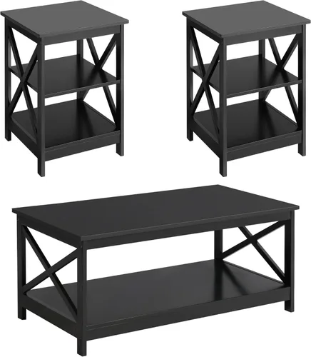 Yaheetech Juego de mesa de madera de 3 piezas para sala de estar, incluye mesa auxiliar X-Design y dos mesas auxiliares de 3 niveles, muebles Negro