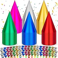 Sotiff Juego de 200 sombreros y sopladores para fiesta de cumpleaños, cono colorido, sombrero metálico de papel de aluminio para niños y adultos,