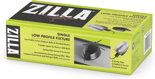 Los accesorios de bajo perfil proporcionan la luz y el calor necesarios a los terrarios sin el volumen de las cúpulas estándar. Estos accesorios proporcionan una amplia propagación de calor y luz y funcionan perfectamente para cualquier reptil. El accesorio individual de perfil bajo alberga un enchufe para una bombilla fluorescente compacta Zilla Mini, una mini bombilla LED Zilla para plantas, un emisor de calor de cerámica Zilla Mini o una bombilla halógena Zilla Mini, mientras que el accesorio doble de perfil bajo alberga dos enchufes y puede contener uno de cada uno. Ambos accesorios vienen con clips de resorte que aseguran el accesorio a cualquier cubierta de pantalla. También vienen con un interruptor de cable en línea para controlar el accesorio. Las bombillas se venden por separado, lo que permite la personalización del calor y los rayos UV necesarios.
