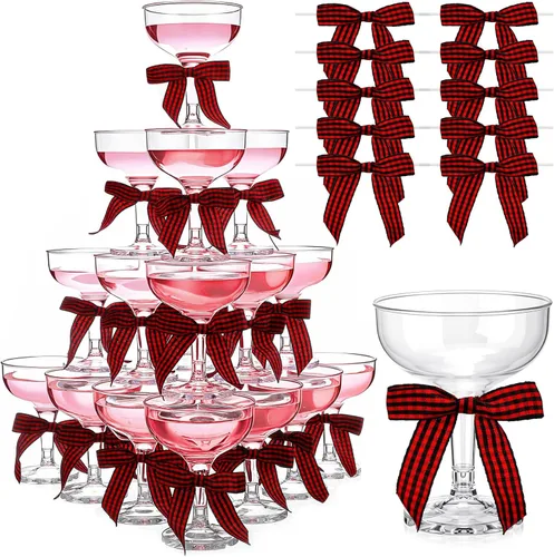 Contenido del juego: este juego incluye 30 copas de cóctel de lazo de Navidad para ayudarte a organizar fiestas inolvidables; la amplia capacidad garantiza que puedas manejar fácilmente varias actividades; también se incluyen 50 elegantes lazos rojos, añadiendo un toque de sofisticación a tu decoración sin el proceso de bricolaje Tamaño compacto: mide 3.15 pulgadas de diámetro en la parte superior y 4.13 pulgadas de alto, esta flauta de champán se adapta fácilmente a una variedad de bebidas, incluyendo vino, cócteles, refrescos o helados; su capacidad de 5 onzas proporciona una sensación perfectamente equilibrada que complementa tus bebidas y decoración Diseñado para torres de champán: estas copas de champán cuentan con tres ranuras en la parte inferior, lo que te permite crear una impresionante torre de champán para animar tu evento; los lazos reutilizables vienen con un giro prefijado para una fácil decoración; simplemente colócalos a regalos o accesorios para mejorar el ambiente festivo Materiales de calidad: estas copas de champán de Navidad están hechas de plástico de calidad, asegurando un consumo seguro sin sacrificar el estilo; no se deforman ni se rompen, lo que te da tranquilidad, haciendo que cada ocasión sea alegre y sin complicaciones Máxima versatilidad: estas copas de champán de plástico son ideales para bodas, cumpleaños, banquetes, bares, restaurantes o fiestas en casa; pueden inyectar belleza y diversión en cualquier ocasión; no importa el lugar u ocasión, es la primera opción para crear entretenimiento elegante